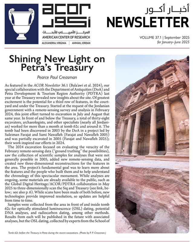 Here you will find Archaeology in Jordan (our biennial scholarly publication of field reports and project updates), Insights (our blog, featuring essays by fellows, other scholars, interns, and more), the semiannual ACOR Newsletter, and open-access digital versions of other publications.